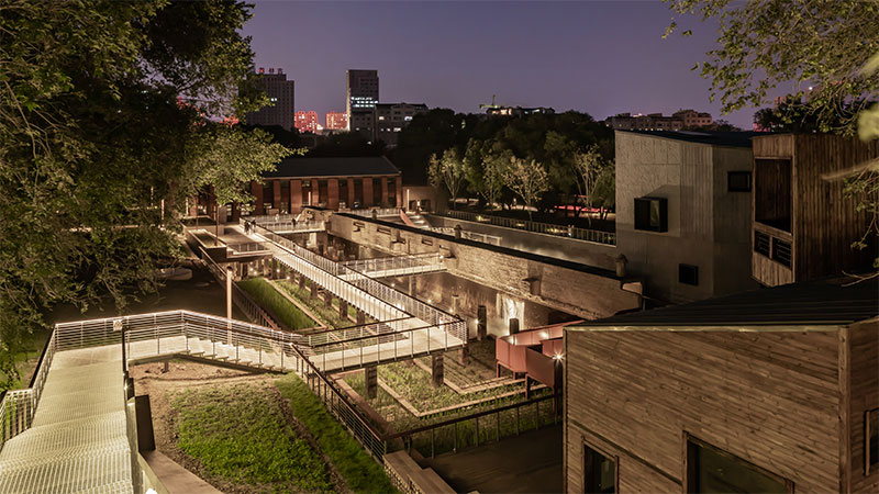 长春水文化生态园通过文化情境再现和历史建筑再利用,设计最大程度地尊重历史文化遗迹,对储水工业遗迹景观进行改造利用,依据地形引导雨水径流,设计台地式雨水花园景观,并保留水池内部结构格局,融入复合活动的花园空间。