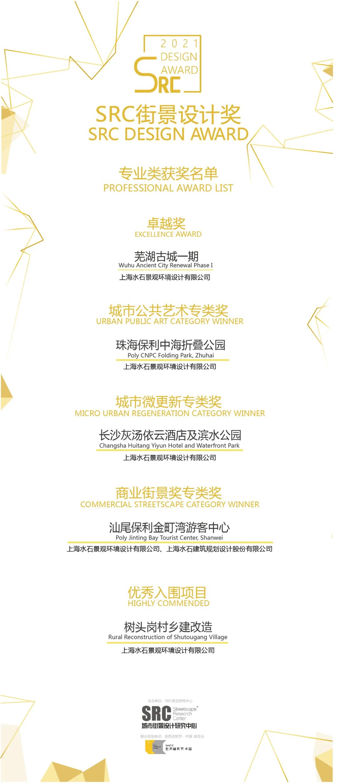 8月18日,2021届SRC街景设计奖颁奖盛典通过线上直播的方式举行。历经一年的申报评选,水石设计共有5项作品脱颖而出,芜湖古城一期摘得卓越奖,珠海保利中油折叠公园摘得城市公共艺术专类奖,长沙灰汤依云酒店及滨水公园摘得城市微更新专类奖,汕尾保利金町湾游客中心摘得商业街景奖专类奖,树头岗村乡建改造获得优秀入围项目。恭喜获奖团队,感谢评委的认可,感谢业主跟合作伙伴的大力支持!