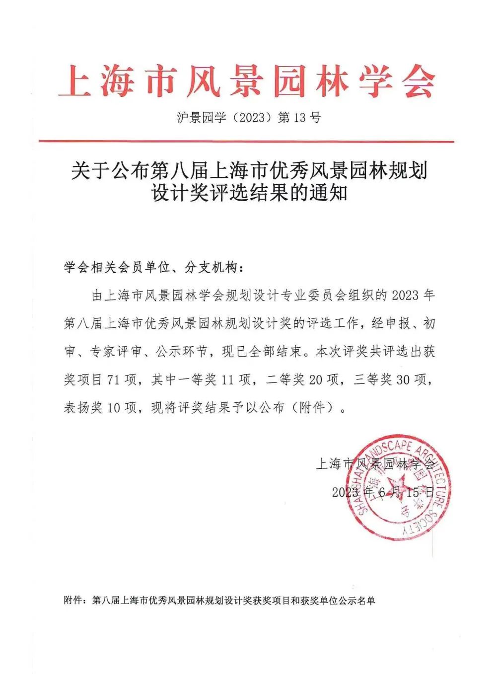 喜 讯,水石设计荣获第八届上海市优秀风景园林规划设计奖4项荣誉!
