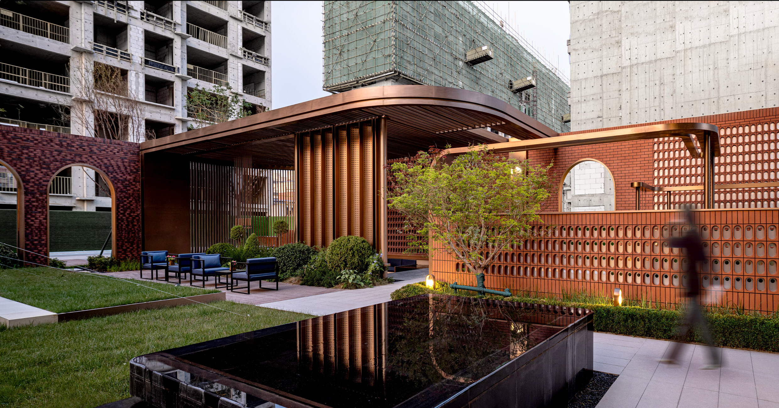 天津是一座融合百年经典与优雅的浪漫都市,其褐石文化在历史的推动下形成独特的城市风景。项目的景观设计在表达经典风韵场景的同时又兼具时尚感与未来生活的前瞻性考虑。景观工艺处理手法多次在建筑特色弧拱元素的基础上进行平面的演化与立面的延伸。景观设计意在传递源自新古典主义的浪漫情怀,在人文与艺术的交织,创新与质朴的交融中,打造经典与时尚一体的城市艺术客厅。