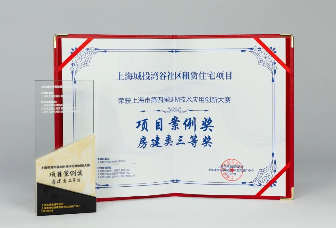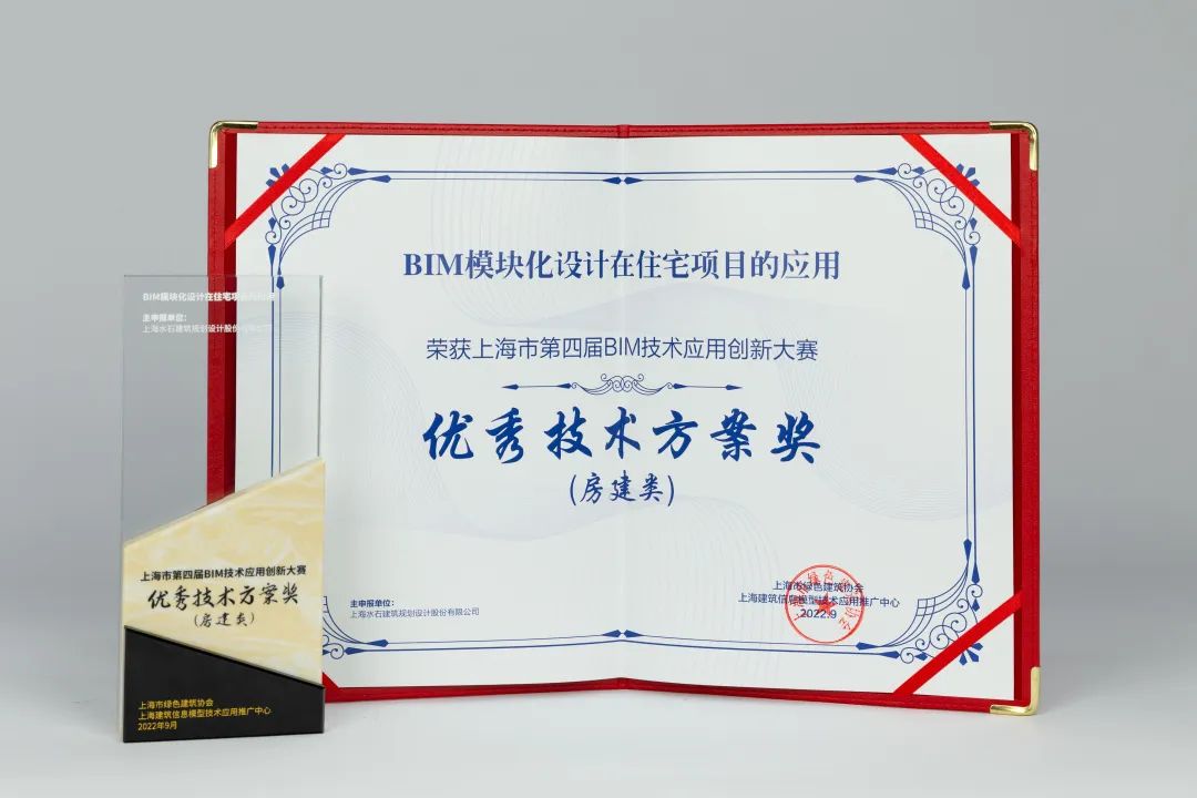 水石设计上海城投湾谷社区租赁住宅项目荣获项目案例房建类三等奖、BIM模块化设计在住宅项目的应用荣获优秀技术方案奖(房建类)、CDE技术研究及实际应用荣获特别创意奖。