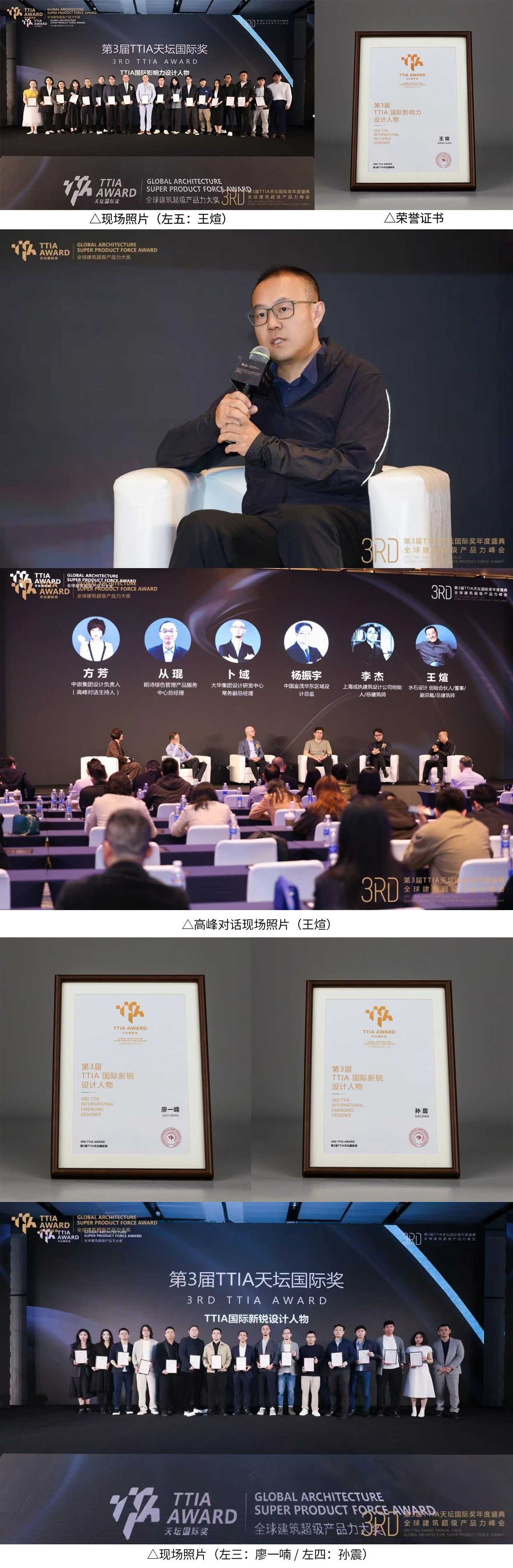 水石设计创始合伙人、董事、副总裁、总建筑师王煊先生荣获“TTIA国际影响力设计人物”,受邀参加了主题为“AI驱动下地产产品设计的未来图景与新常态应对”的高峰对话。水石设计合伙人、建筑一部执行总经理廖一喃,水石设计合伙人、建筑四部总经理孙震荣获“TTIA国际新锐设计人物”。